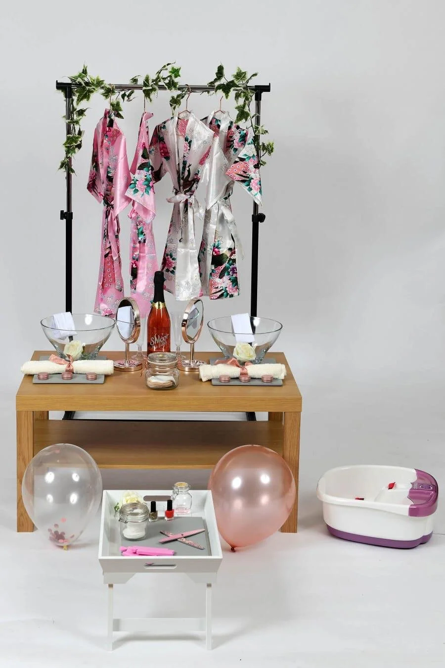 £15 per person. Includes individual glass bowls, headbands, satin robes, face cloths, hand towel, cleanser, toner, facemask and moisturiser. Optional foot station (£5) includes foot cream, nail polish and files.