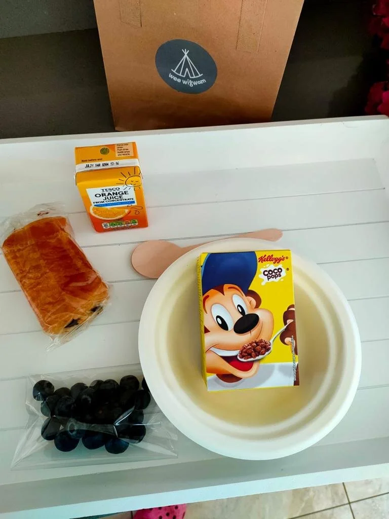 £4 per person. Includes, drink, fruit, brioche, and cereal with disposable bowl and spoons.